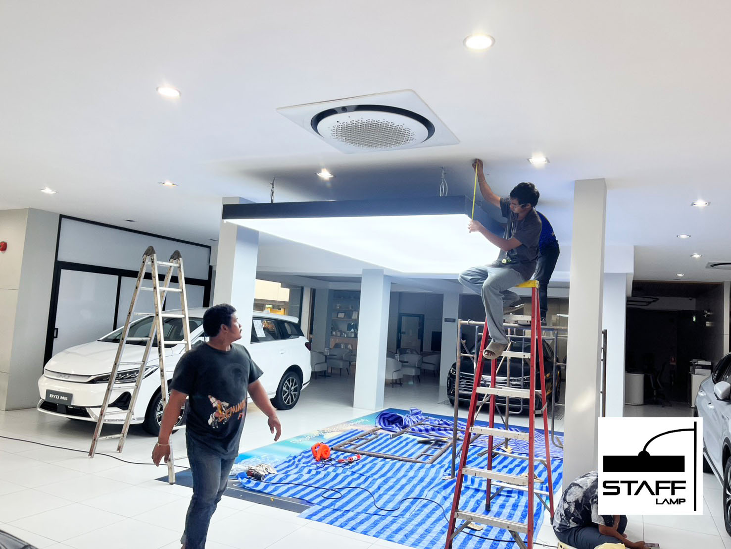 เบื้องหลังความเรียบหรูของโชว์รูม BYD ที่ลูกค้าได้เห็น อาจดูนิ่ง เรียบ และสมบูรณ์แบบ แต่ในความเป็นจริง งานโคมไฟผ้า Barrisol (Stretch Ceiling) ชุดนี้ คือผลลัพธ์ของการวางแผนและลงรายละเอียดในทุกขั้นตอนอย่างพิถีพิถัน