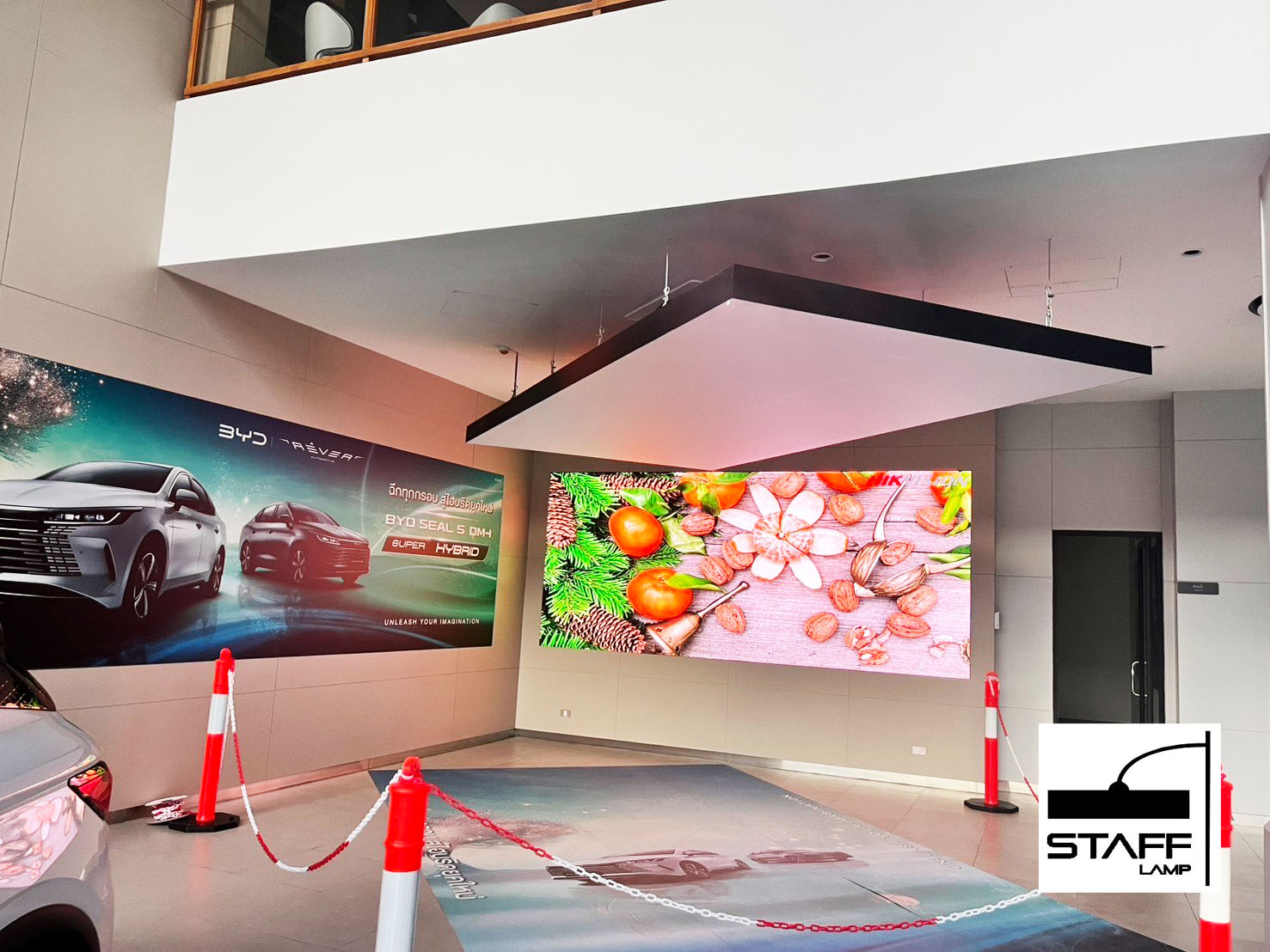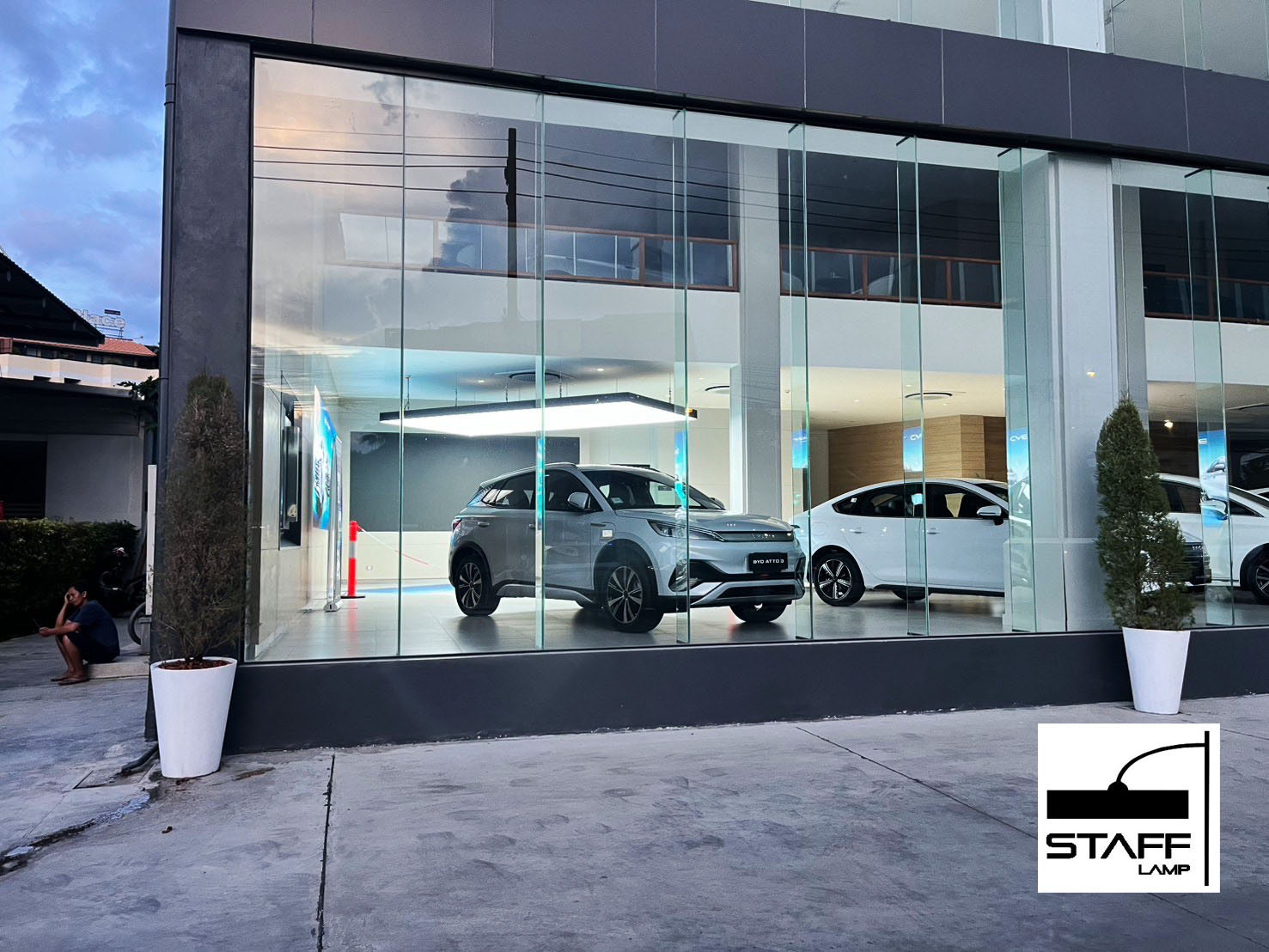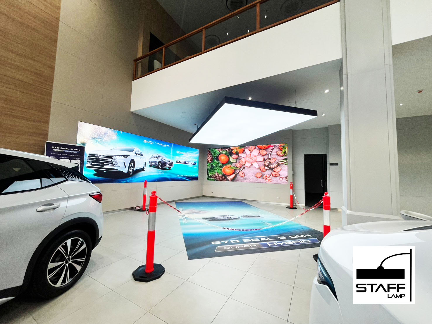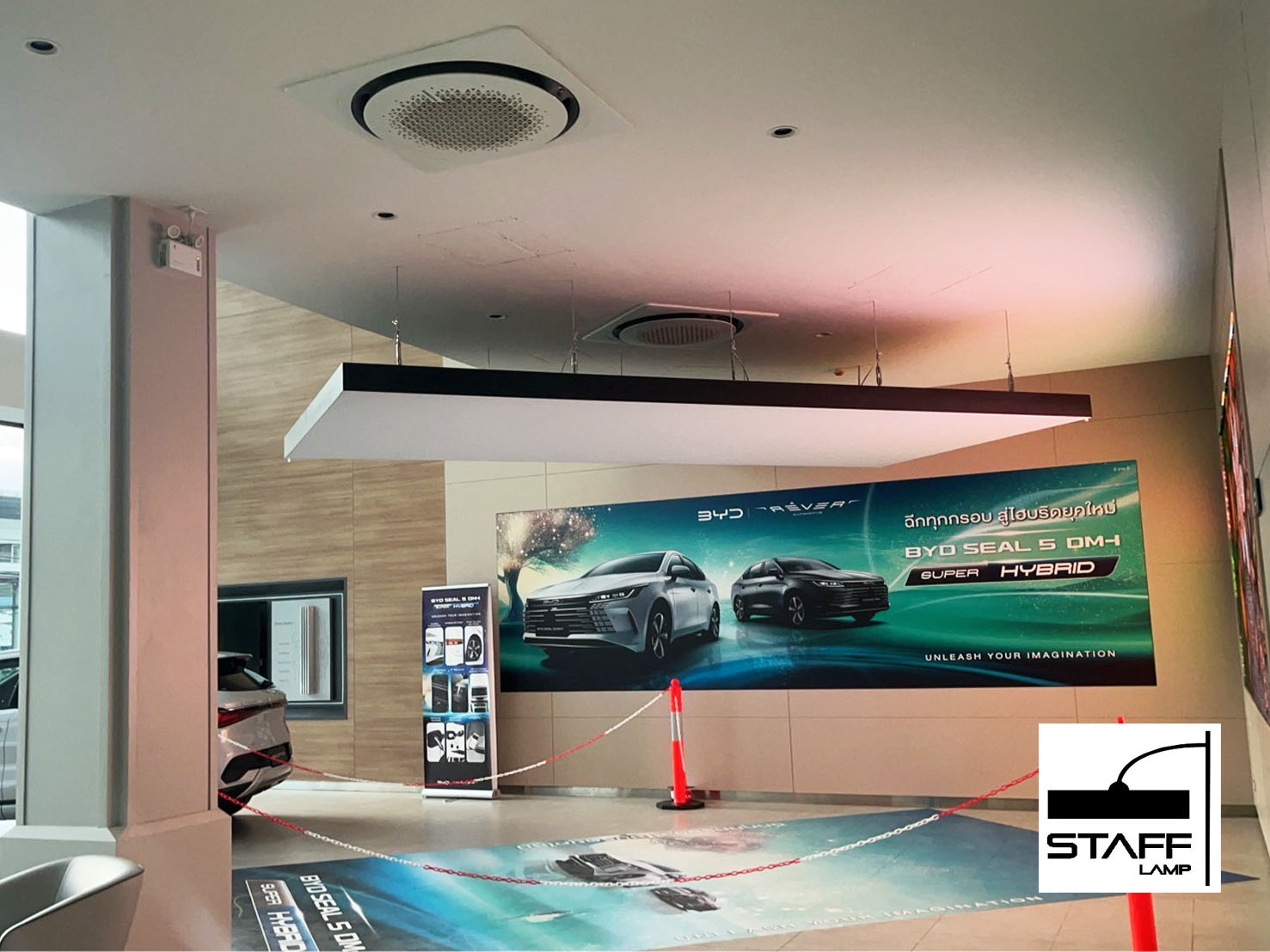 หัวใจของงานนี้อยู่ที่ “แสง” ทีมงานเลือกใช้ LED Module ระยะห่างเพียง 6 ซม. ซึ่งถี่กว่ามาตรฐานทั่วไป เพื่อให้แสงที่ได้เรียบ เนียน และสม่ำเสมอที่สุด แสงถูกกำหนดที่ 5000K โทนใกล้เคียงแสงอาทิตย์ เพื่อถ่ายทอดสีสันและเส้นสายของรถยนต์ไฟฟ้า BYD ได้อย่างคมชัด พร้อมควบคุมความสว่างให้ ไม่น้อยกว่า 1,000 Lux ซึ่งเป็นระดับที่เหมาะสมสำหรับโชว์รูมระดับพรีเมียม อีกหนึ่งรายละเอียดที่หลายคนอาจไม่เห็น แต่ทีมงานให้ความสำคัญเป็นพิเศษ คือ ความสูงของกล่องโคมไฟ 12 ซม. ระยะนี้ถูกคำนวณมาอย่างแม่นยำ หากต่ำเกินไปจะเห็นเม็ด LED หากสูงเกินไปแสงจะสูญเสียพลังงาน ทุกเซนติเมตรจึงมีผลต่อคุณภาพของแสงที่ออกมา ในด้านระบบไฟฟ้า โคมไฟผ้าขนาดใหญ่ 480 x 240 ซม. ใช้ LED จำนวนมาก ทีมงานจึงเลือกใช้ หม้อแปลงคุณภาพสูงไม่น้อยกว่า 4 ตัว เพื่อกระจายโหลด ลดความร้อน และยืดอายุการใช้งานของอุปกรณ์ทั้งหมด นี่คือแนวคิดของ Staff lamp ที่เลือก “ความเสถียรระยะยาว” มากกว่าการประหยัดต้นทุนระยะสั้น เมื่อโคมไฟถูกติดตั้งเสร็จ และแสง 5000K ค่อย ๆ สว่างขึ้นเหนือพื้นที่จัดแสดงรถยนต์ ทุกองค์ประกอบตั้งแต่โครงสร้าง แสง และสัดส่วน จึงทำงานร่วมกันอย่างลงตัว กลายเป็นแสงที่ไม่แย่งความโดดเด่นของรถ แต่ช่วยขับให้ตัวรถดูสง่างาม มีมิติ และทรงพลังยิ่งขึ้น นี่คืออีกหนึ่งงานที่ Staff lamp ไม่ได้มองว่าเป็นแค่ “โคมไฟ” แต่คือส่วนหนึ่งของประสบการณ์ในโชว์รูม และเป็นรายละเอียดเบื้องหลังที่ช่วยยกระดับแบรนด์ BYD ให้สมบูรณ์แบบในทุกมิติ